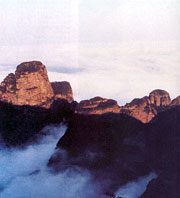 人间仙境——圣堂山 大瑶山主峰圣堂山,为泥盆系紫红色砾岩和砂石组成,经自然力的作用和地表水长期侵蚀、切割、风化,崩解为丹峰挺拔、朱崖壁立、棱角刚锐、峡谷幽深的大瑶山丹霞式刚棱削面塔柱地貌。 每当清晨山高红日升、谷深云海阔、鸟鸣声声、云涛阵阵之际,置身奇峰浮云、松篁交翠、猿鹤相亲的巨幅画卷之中。那难以数计的鳞次柿比、丛罗棋布的奇峰怪石,有的似长柱神鞭立地顶天;有的像铜墙铁壁巍然屹立;有的如晃板垒卵摇摇欲坠;有的若顽猴赏月寿龟戏花,呼之即出,栩栩如生;有的仿佛宝鼎古董,玲珑剔透。那朱丹的颜色,在霞光照耀下似美人略施粉黛,透出羞涩令个人神往,让人陶醉。前来寻幽揽胜的游人,无不赞叹圣堂山峰峦怪石之神奇、诡秘,称道圣堂山真乃“人间仙境”。
